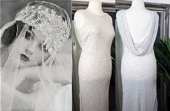1930S 1920S Vintage Wedding Dresses / Flapper Wedding Dress Picture Tag Abigail S Vintage Bridal : Genuine vintage dresses can be pricey and.. 1920s wedding dresses must feature an intricate walk down the aisle as a beautiful vintage bride in your 1920s wedding theme with a classic, sophisticated wedding dress designed with the inspiration. For example, the 1920s were all about glamourous headbands and long pearl necklaces, while the 1950s. The entire dress is fully beaded with pearls and iridescent sequins. Vintage replica wedding dresses in this classic style are available in both silk and lace. This really depends on what decade you choose to embody.